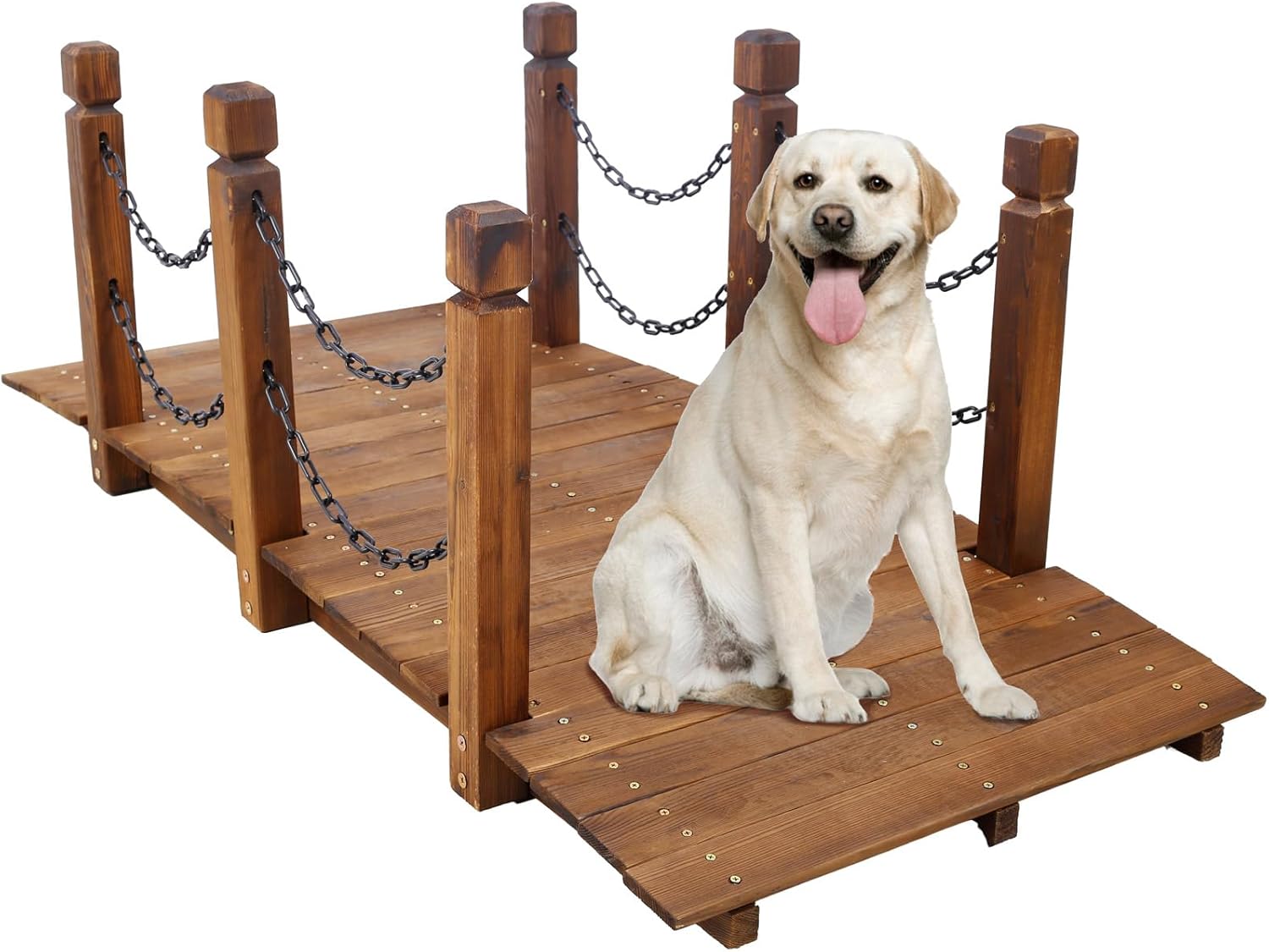 Transform your outdoor space with this charming 5-foot wooden garden bridge. Perfect for enhancing the visual appeal of your garden, pond, or landscaping, this decorative bridge adds a touch of rustic elegance to any setting. The classic arch design creates an eye-catching focal point while providing a functional pathway across garden features. Crafted from wood, this bridge brings natural warmth and character to your outdoor living area. Its 5-foot span makes it ideal for smaller garden spaces, creating an intimate atmosphere in your backyard retreat. The bridge's sturdy construction allows for both decorative purposes and light foot traffic, making it a practical addition to your landscape design. Whether spanning a dry creek bed, connecting garden paths, or serving as an ornamental feature, this wooden garden bridge adds timeless charm to your outdoor sanctuary. Regular sealing or staining is recommended to maintain its beauty through the seasons.