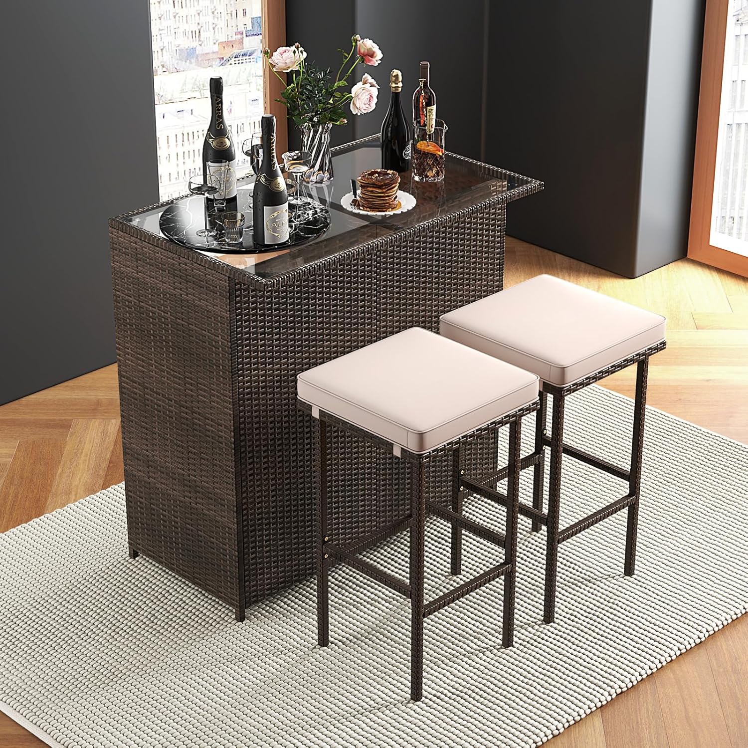 Description:Crafted with durability in mind, our patio bar set includes a robust table and two ergonomic stools, all woven with PE rattan over sturdy metal frames to withstand extended outdoor use. The stools are designed with footrests for leg support and feature cushions filled with high-density sponge for added comfort, which can also be removed for a cooler seating option. In the meantime, the bar table provides handy storage for your cups and bottles with its built-in 2-tier storage. The spacious tempered glass top makes a prefect stage for showcasing your bartending skills. Maintenance is a breeze; simply wipe the table with a damp cloth to keep it looking pristine, while the removable, washable cushion covers keep your set inviting. Enjoy quality outdoor times with our 3 Pcs rattan patio set!Features:Rattan bar set of 3 for versatile indoor and outdoor useCrafted with wear-resistant PE rattan for long-lasting beauty and useReinforced support with sturdy metal frame and tempered glass topBuilt-in 2-tier storage keep your bar necessities organized and ready by your handsTable comes with extended edge for ample operation space and legroomStool cushions are filled with resilient sponge for relaxed seatingCushions attached with hook and loop fasteners for fast removal when neededEasy to clean with glass tabletop and removable seat coverEquipped with protective foot pad to avoid scratching the floorSpecifications:Color: Mix Brown + BeigeMaterial: PE Rattan, Metal, Tempered Glass, Polyester, SpongeDimensions of Table: 38.5” x 23” x 39”/ 98 x 59 x 100 cm (L x W x H)Dimensions of Each Stool (with Cushion): 16” x 16” x 30”/41 x 41 x 76.5 cm (L x W x H)Upper Storage Cube (Inner Dimension): 36.5” x 17.5” x 16”/93 x 45 x 41.5 cm (W x H x D)Lower Storage Cube (Inner Dimension): 36.5” x 17” x 16”/93 x 43.5 x 41.5 cm (W x H x D)Seat Height (without Cushion): 28”/71 cmWeight Capacity of Tabletop: 100 lbs/45 kgWeight Capacity of Each Shelf: 100 lbs/45 kgWeight Capacity of Each Chair: 400 lbs/180 kgNet Weight: 53 lbs/24 kgPackage Includes:1 x Patio Bar Table2 x Patio Bar Stools1 x User Guide