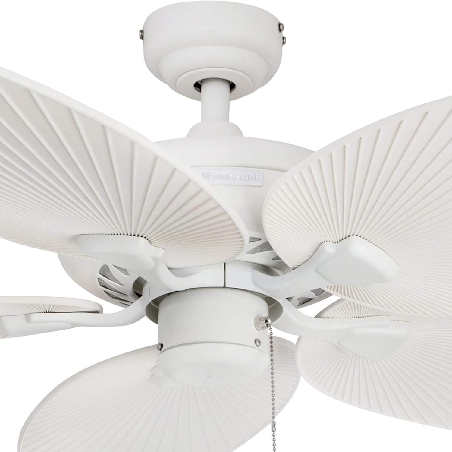 The Palm Island wet-rated tropical, large ceiling fan (no light) combines stylish details with breezy influences for a truly inspiring fixture for your home. Its island-inspired hardware accompanies an innovative 5-blade design that provides adjustable, energy-efficient airflow. Control your Honeywell fan with an easy-to-use pull chain. For year-round comfort, change the direction of our ceiling fans without lights to reverse airflow. During summer, these indoor/outdoor ceiling fans provide a cooling effect, and throughout winter, our strong fan can reverse to spread warm air, helping reduce energy costs. This gorgeous high powered fan blends with many decor styles. When paired with your decor, this palm leaf ceiling fan can transform into a beachy mid-century modern ceiling fan or the boho vintage ceiling fan you've been seeking. Whether you need a porch fan, a patio fan, an outdoor kitchen ceiling fan, a garage fan, a breezeway fan, a sunroom fan, or a four seasons room fan, this white ceiling fan has you covered.