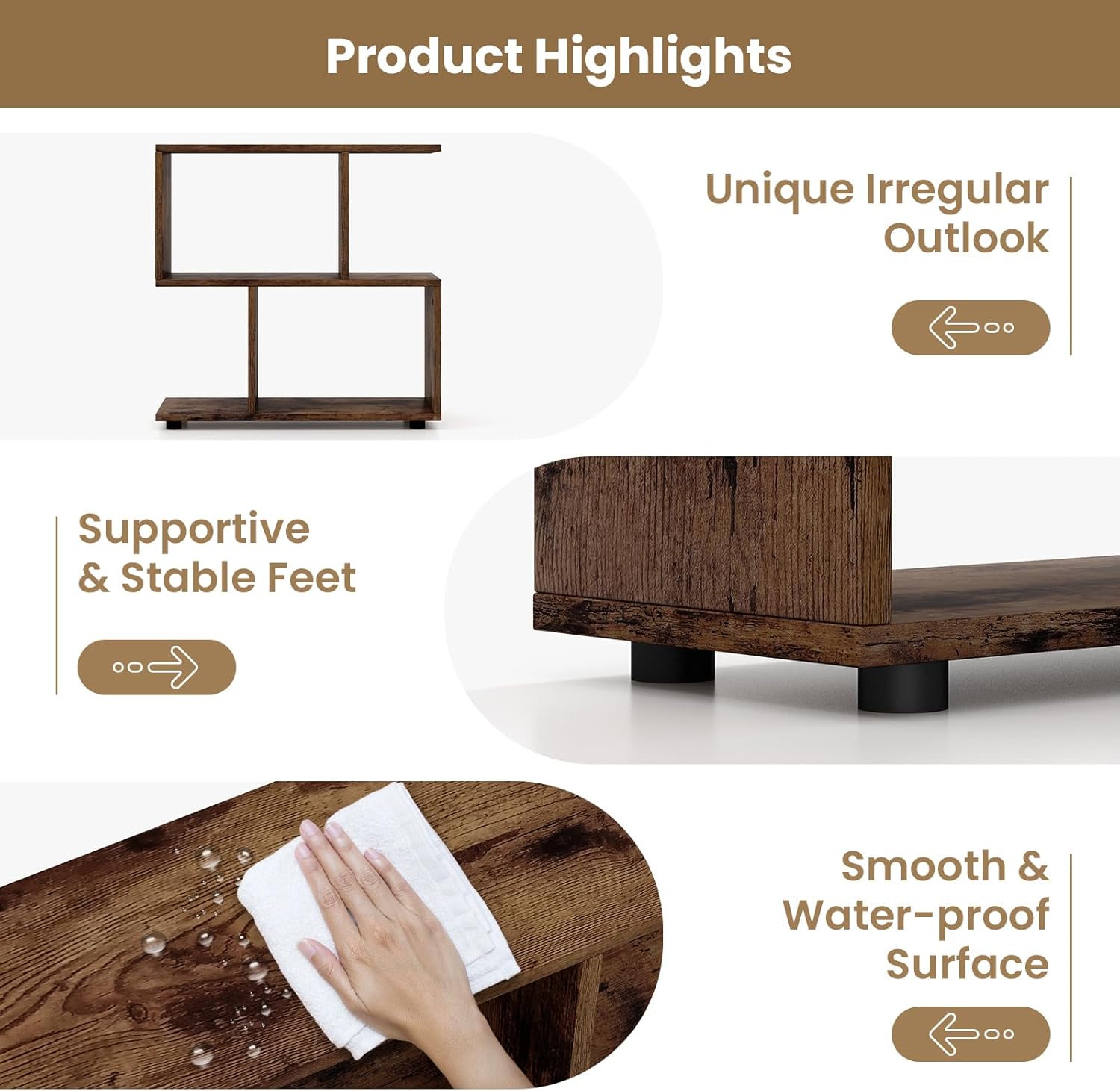 Tangkula 2 Tier Geometric Bookshelf, Freestanding Wood Display Shelf, Home Office Room Divider S Shaped Open Bookcase, Small Bookshelf for Small Spaces, Living Room, Study (Coffee, 1)