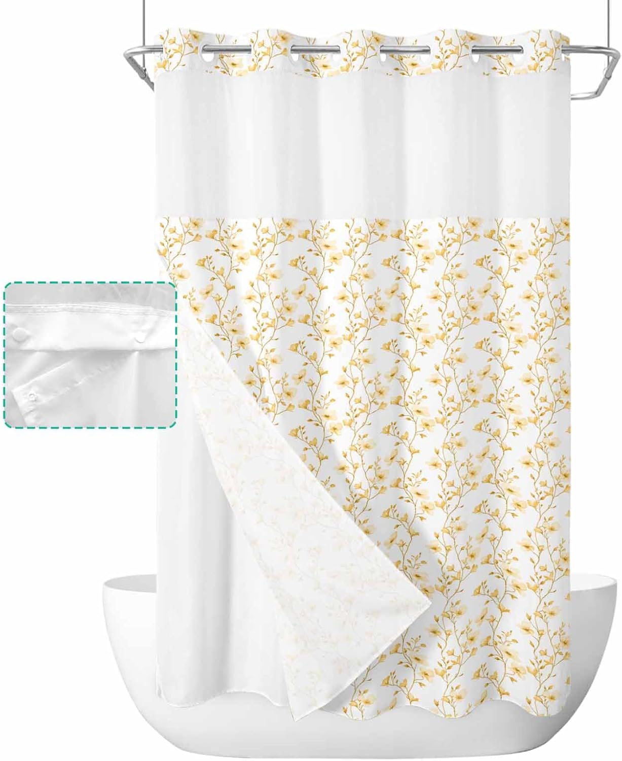 Pretty No Hook Shower Curtain Well Made & Easy to Hang Printed Shower Curtain With Snap in Liner Our shower curtain adopts high-definition printed design with unique patterns and bright colors, which matches your bathroom accessories and adds some elegance to your bathroom. Premium Fabric Waterproof Fabric. Made of premium polyester blend fabric, our no hook shower curtain with snap in liner is waterproof and dries quickly, keeping the floor outside the shower dry and clean. See Through Top Window Unique top sheer design. Our shower curtain no hooks with liner with top transparent protects privacy while remaining transparent, allowing you to see outside the shower area while showering, keeping the bathroom ventilated and breathable. Double Shower Curtain Hotel shower curtains with snap on liners with replaceable liners can protect your privacy while showering and are easy to remove and replace for easy cleaning and care. Great Choice Our decorative and practical shower curtain are ideal bathroom decoration choices and are also good choices on birthday, Halloween, Thanksgiving, Christmas for your friends and family. Machine Washable Shower Curtains Machine wash in cold water, gentle cycle, tumble dry low. Suitable for busy families. Specification Material: Polyester Blend Fabric Size: 36x72 Inch/ 36x78 Inch/ 48X72 Inch/ 54x78 Inch/ 60x72 Inch/ 66x72 Inch/ 72x72 Inch/ 72x78 Inch/ 72x84 Inch/ 72x96 Inch Package: 1x Shower Curtain and 1x Inner Liner