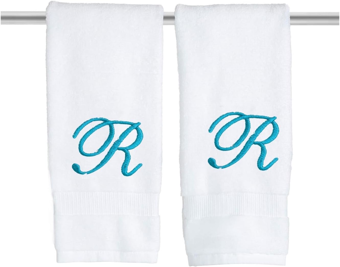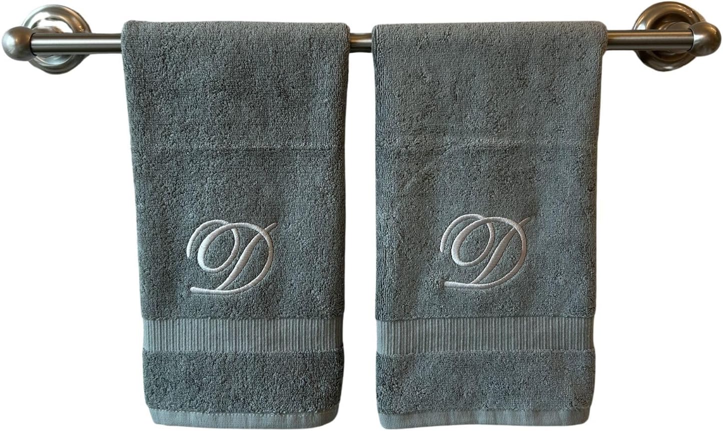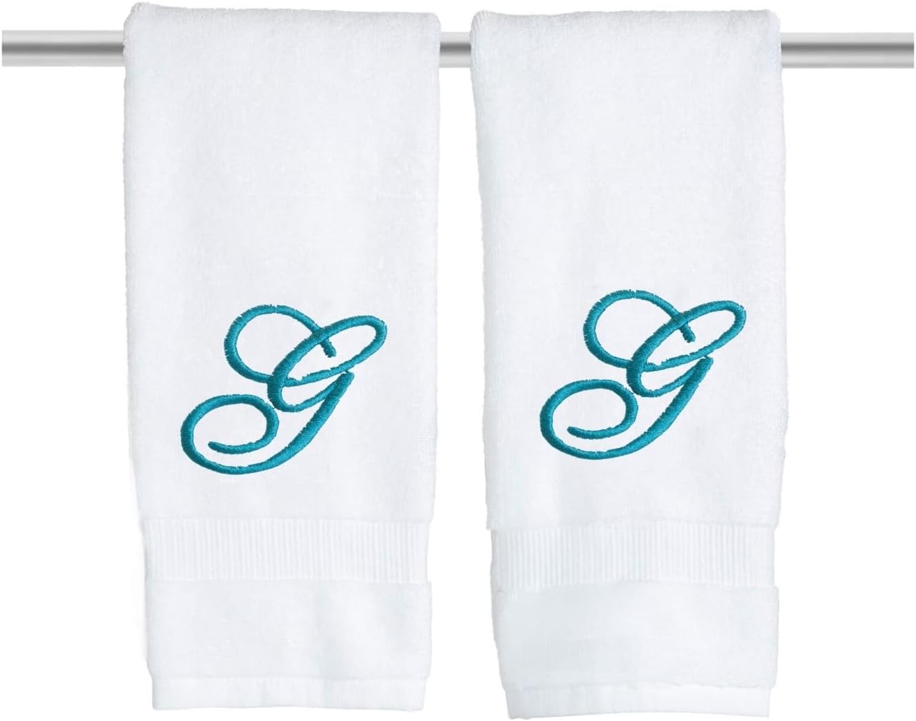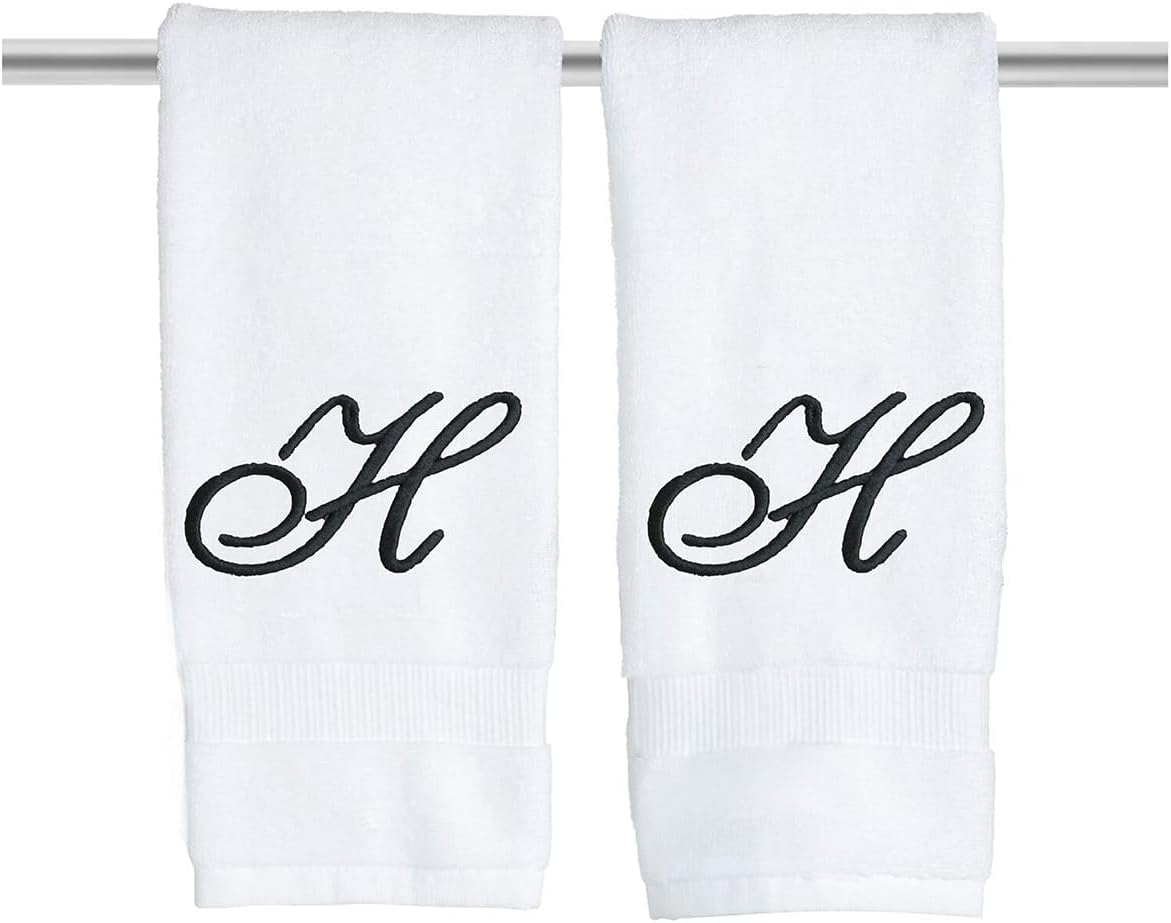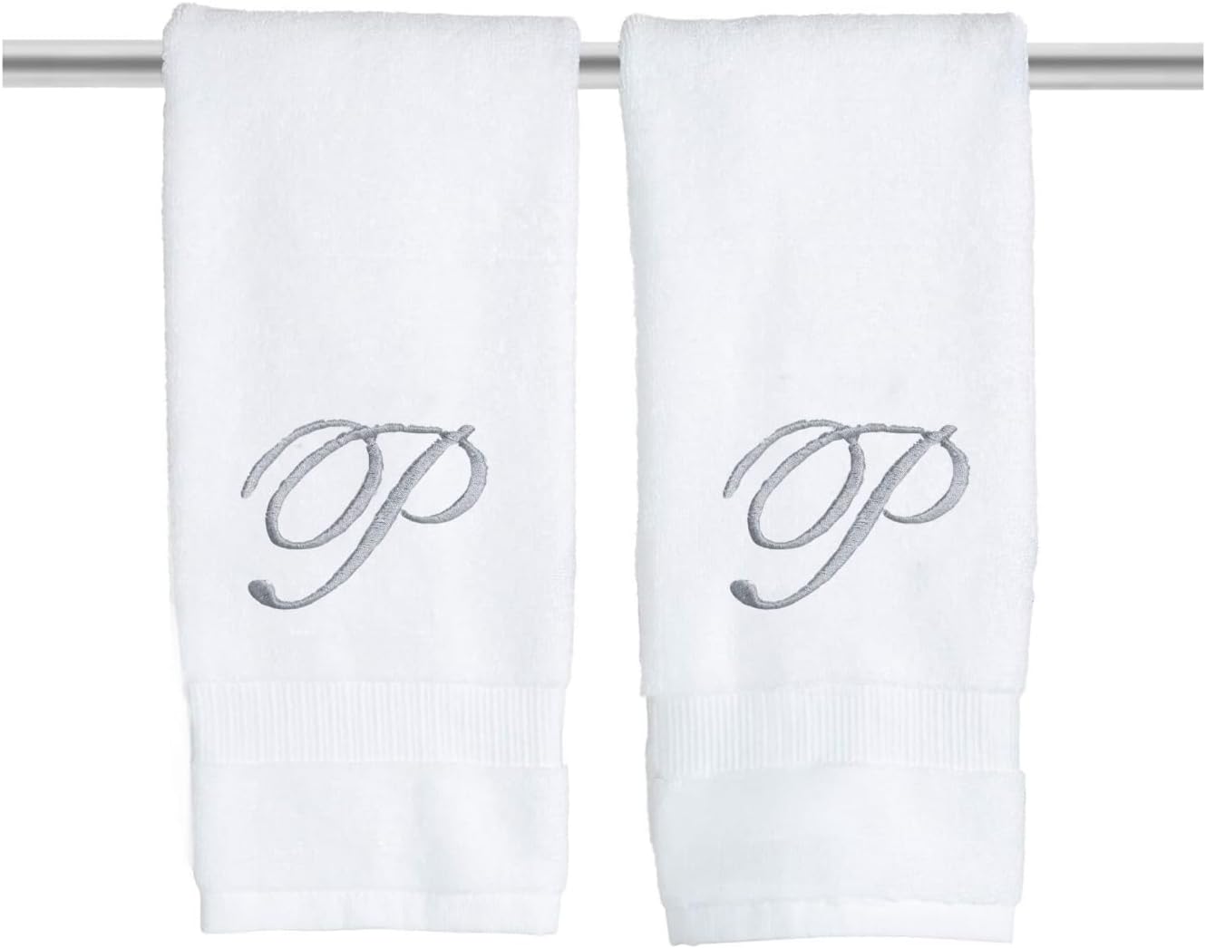 GOTS Organic certified set of two white luxury quality monogrammed hand towels for bathroom or powder room gives your home that hotel or spa like vibe