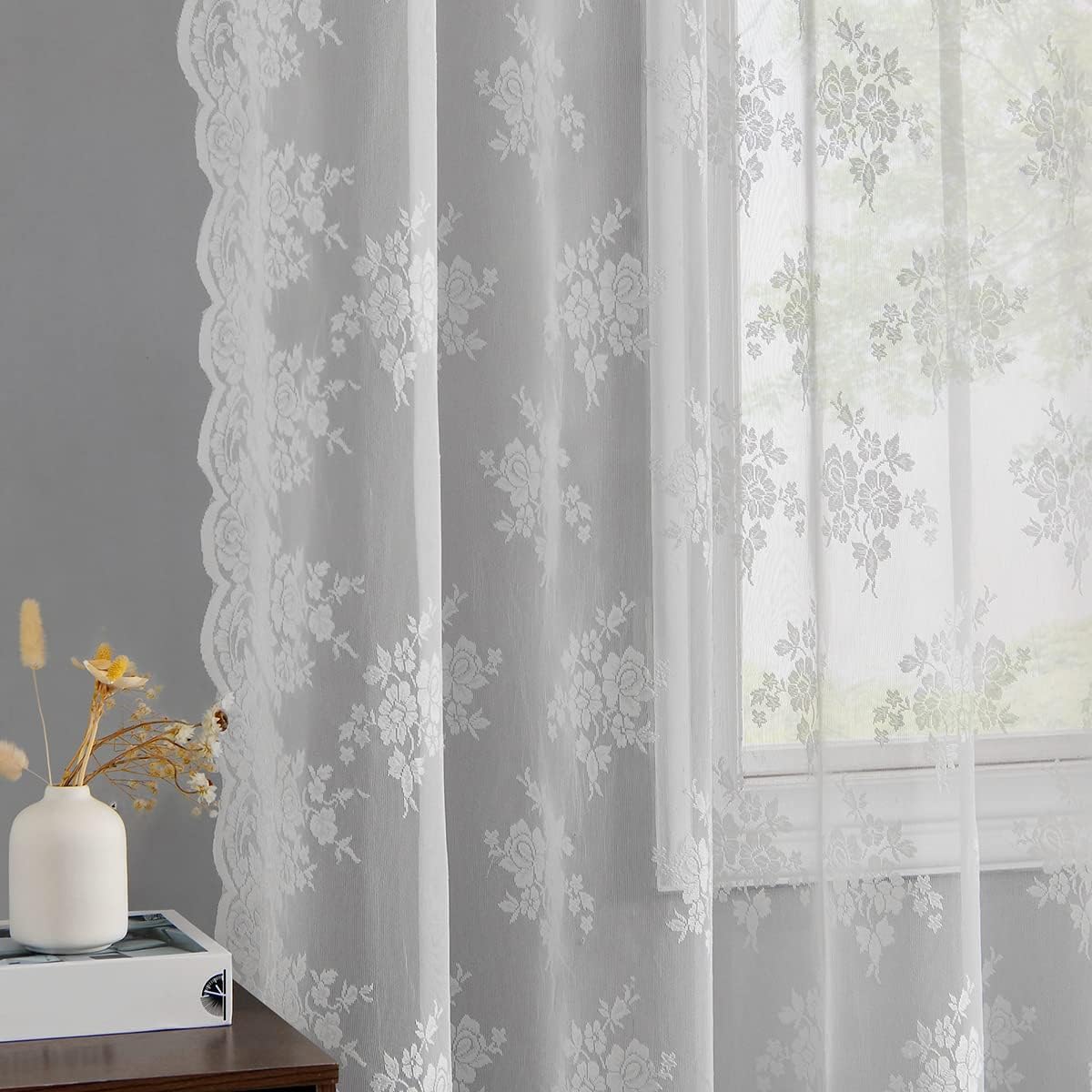 Kotile Sage Green Sheer Curtains 95 Inches Long, Country Rustic Floral Spring Sheer Curtains for Living Room, Grommet Privacy Vintage Sheer Lace Curtains, 52 x 95 Inch, 2 Panels, Sage GreenProduct Overview: 100% Premium Polyester Quality and Soft Lace Fabric 100% Brand New Sheer Lace Curtains Available Size: 52 in. Width x 45 in. Length (each) 52 in. Width x 54 in. Length (each) 52 in. Width x 63 in. Length (each) 52 in. Width x 72 in. Length (each) 52 in. Width x 84 in. Length (each) 52 in. Width x 90 in. Length (each) 52 in. Width x 95 in. Length (each) 2 Panels Per Package Color: Sage Green Modern rust-free silver grommets top (1.60-inch inner diameter) Green sheer curtains offer some privacy & soften the glare from outside Perfect for bedroom, living room, dining room, girls room, and more…Easy Care: Machine Wash Gentle Cycle Tumble Dry Low Cool Iron as Needed Do Not BleachThese Kotile floral sage green sheer curtains are a beautiful, breezy way to add light and airy texture to your window without a lot of fuss.